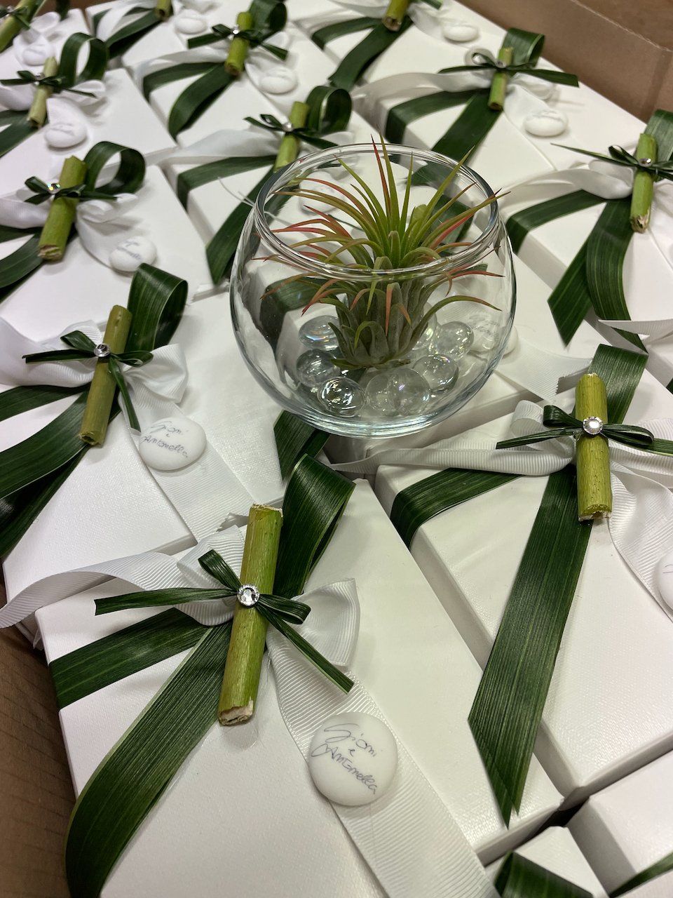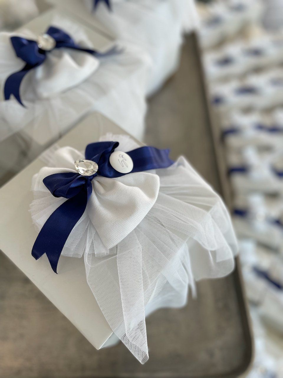 Le decorazioni della bomboniera vengono confezionate artigianalmente una ad una, utilizzando applicazioni esclusive e personalizzate a seconda delle vostre richieste.