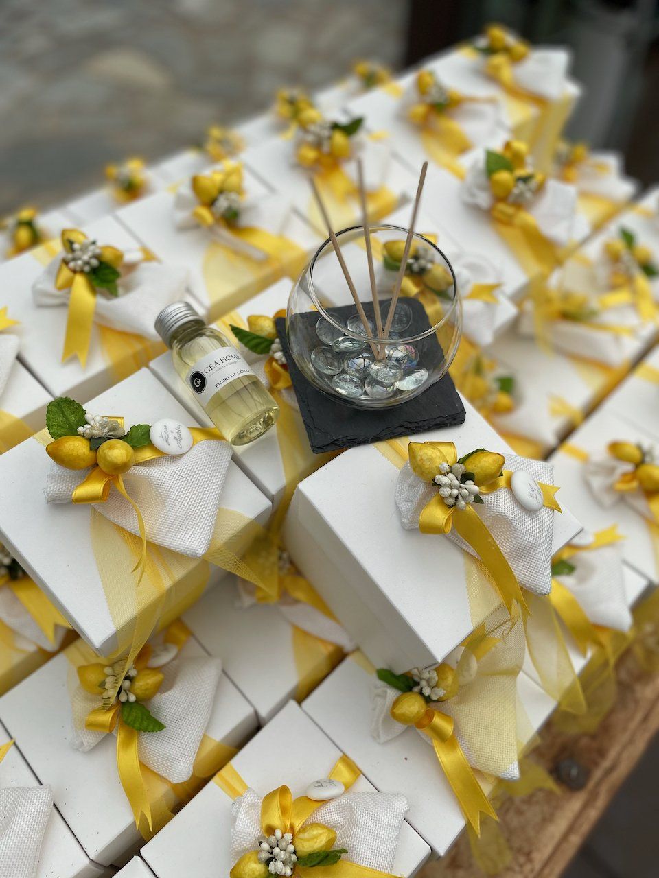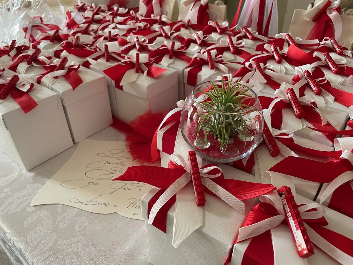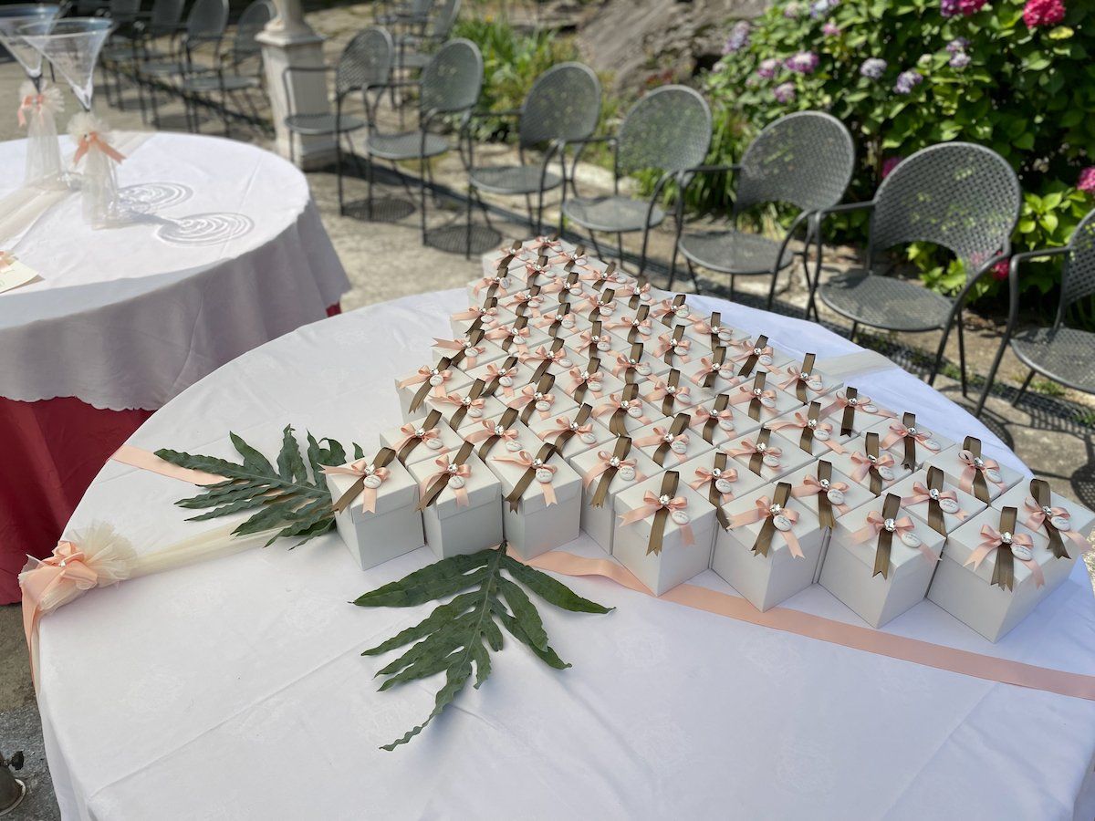 In negozio è presente un'ampia selezione di sacchetteria, scatoline e barattolini e tra le personalizzazioni viene proposto un servizio di incisione a mano del nome o delle iniziali degli sposi.