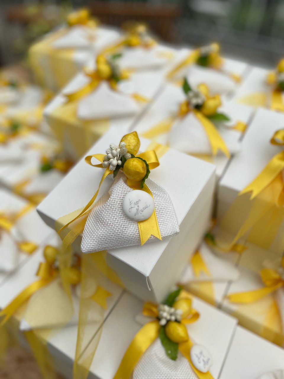 I Confetti utilizzati per il confezionamento delle bomboniere sono Avole siciliane di altissima qualità, mentre quelli utilizzati per le degustazioni sono quelli proposti da Maxtris nella sua ampia proposta di gusti.